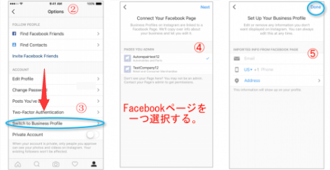 ※注:ジネスプロフィールへの切り替えにFacebookページが不要になりました。(2018年10月30日現在)