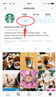 @starbucksjpn:ビジネスプロフィールが導入されているアカウント。PCでの閲覧では表示されないが、モバイルでは[連絡する]ボタンが表示される。