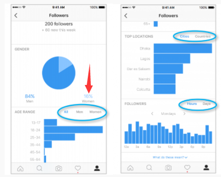 ただし、Instagramのビジネスプロフィールで年齢や性別など利用者層の指標を確認するには、100人以上のフォロワーが必要です。