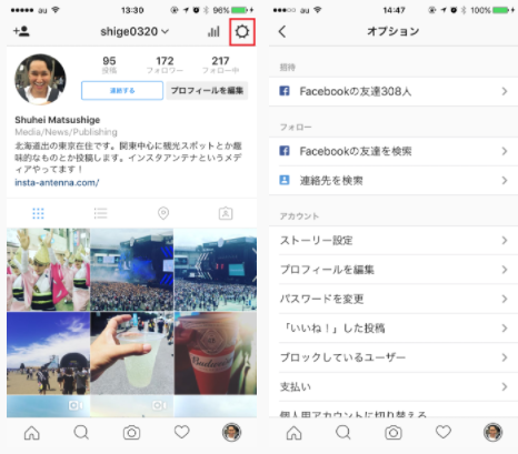 現在のInstagramの個人用プロフィールを”ビジネスプロフィール”に変更するための手順をご紹介します。
