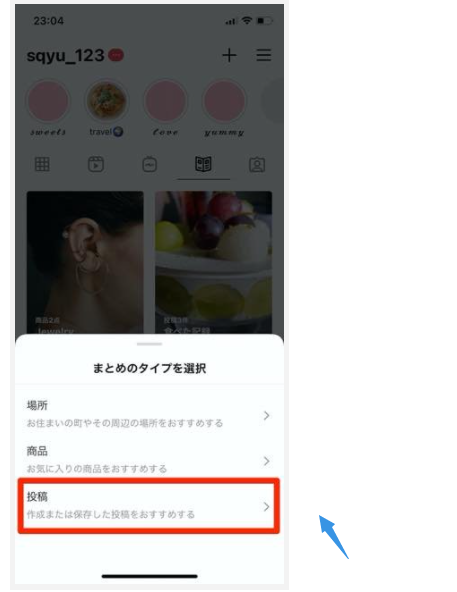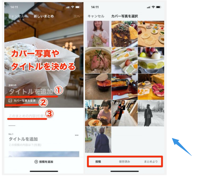 自分の投稿や、コレクションに保存してある投稿を「まとめ」に選んで作成する手順を解説します。