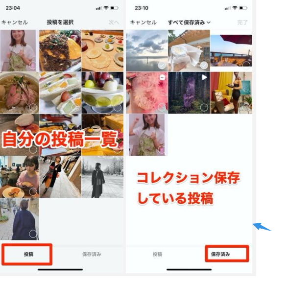 画面下の保存済みへ切り替えると、これまでにコレクション保存した投稿から選択も可能です。ただし、非公開アカウントの投稿は、保存済みの投稿に表示されません。