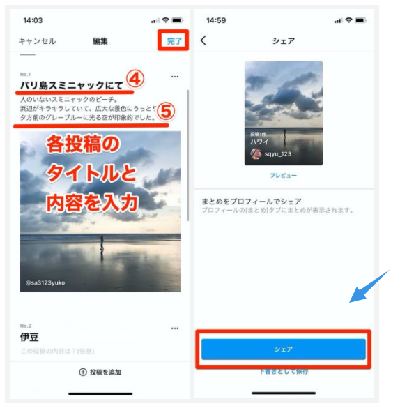 最後に、各投稿のタイトルと内容を入力します。右上の完了をタップし、次の画面でシェアを選択すれば、まとめ記事がプロフィール画面上に公開されます。