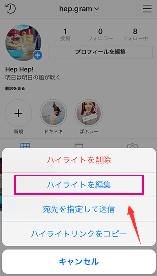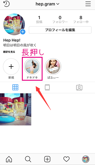 Instagramプロフィール画面にアクセスしたら、削除、または編集したいハイライトを長押しする。