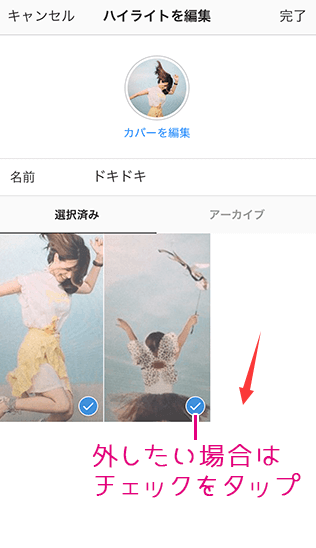 するとハイライトに追加したストーリーの一覧が表示されるので、除外したいストーリーをタップして除外する。なお、カバー画像やハイライトのタイトルもここで編集が可能だ。