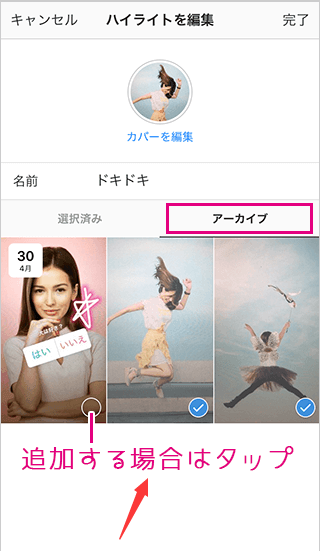 ストーリーを更に追加したい場合は、アーカイブのタブを選択し、追加したいストーリーをタップして完了で追加できる。