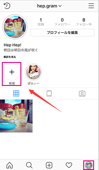 Instagramプロフィールから追加する方法を見てみよう。右下のInstagramプロフィール画面を開いたら、+新規のアイコンをタップする。