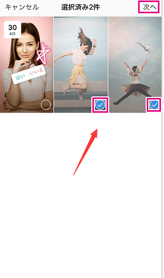 すると投稿したストーリーの一覧が表示されるので、追加したいストーリーをタップする。ちなみに、複数のストーリーを選択した場合、並び替えはできず、時系列に動画が再生される。終わったら右上の次へをタップする。