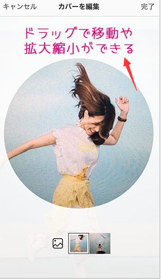 カバー画像は、ストーリーからのサムネイル画像かライブラリから選択できる。また、カバー画像はドラッグして移動したり、枠に合わせて拡大縮小ができる。終わったら完了をタップする。