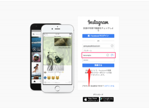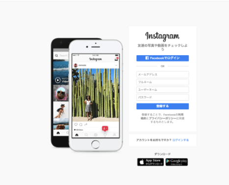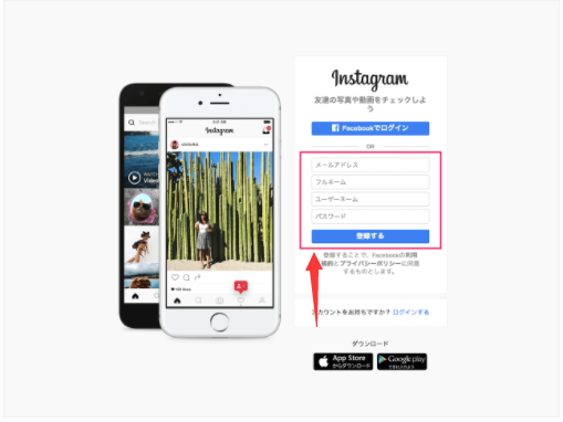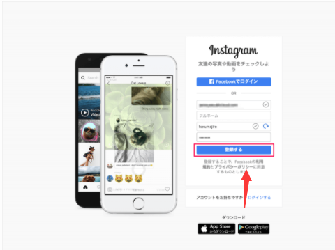 その場合には、instagram.comにアクセスするとアプリと同じようにユーザーidを新規で申し込みできます。