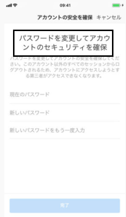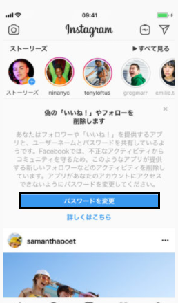 アプリ内メッセージを受け取った場合は、パスワードを変更して、サードパーティアプリからアカウントが使用できないように設定してください。