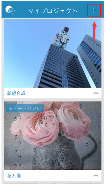 ↑「マイプロジェクト」画面で「+」をタップし、「iPhoneから」→「カメラロール」で加工したい写真を選ぶ