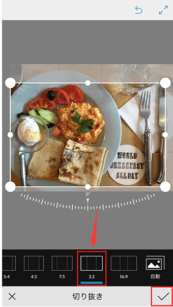 ↑画面下部の写真の比率を選択すると、そのサイズで切り抜いた場合のプレビューを確認できる。写真の下にある分度器をなぞると、傾きを調整可能。編集を終えたら、画面右下のチェックアイコンをタップする