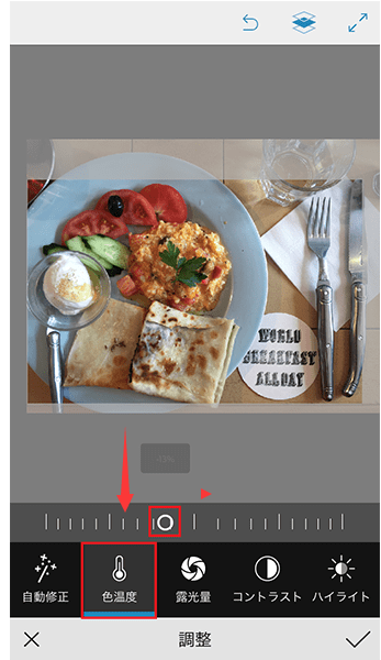 ↑ここでは「色温度」を選択。スライドバーのアイコンを右に動かすと赤っぽく、左に動かすと青っぽくなる