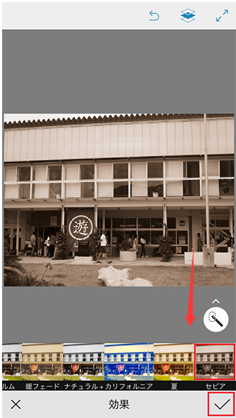 ↑新規プロジェクトのトップ画面で「効果」を選択し、適用したいフィルターを選ぶ。このまま保存する場合はチェックアイコンをタップする