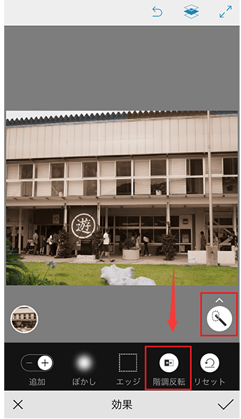 ↑部分的にフィルターを適用するには、「範囲選択」アイコンをタップしてフィルターを適用したい範囲を指でなぞる。「快調反転」をタップすると、なぞった箇所以外に適用される